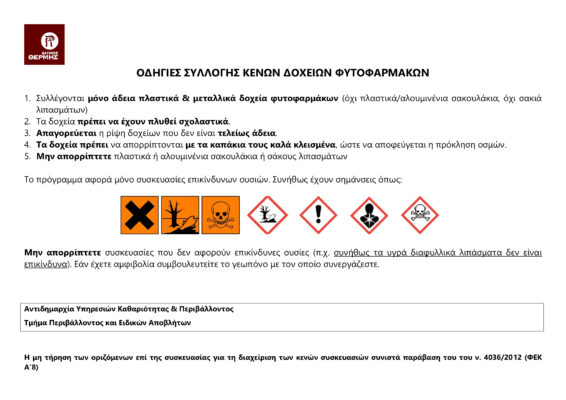Το Τμήμα Περιβάλλοντος και Ειδικών Αποβλήτων της Διεύθυνσης Ανακύκλωσης, Καθαριότητας και Περιβάλλοντος του Δήμου Θέρμης ανακοινώνει ότι συνεχίζονται και για το έτος 2026 οι δράσεις συλλογής και ανακύκλωσης κενών πλαστικών συσκευασιών φυτοφαρμάκων, ως επικίνδυνων αποβλήτων. Ο Δήμος Θέρμης συνεχίζει τη συλλογή τους σε καθορισμένα σημεία στις Κοινότητες: Βασιλικών, Θέρμης, Κάτω Σχολαρίου και Τριλόφου.